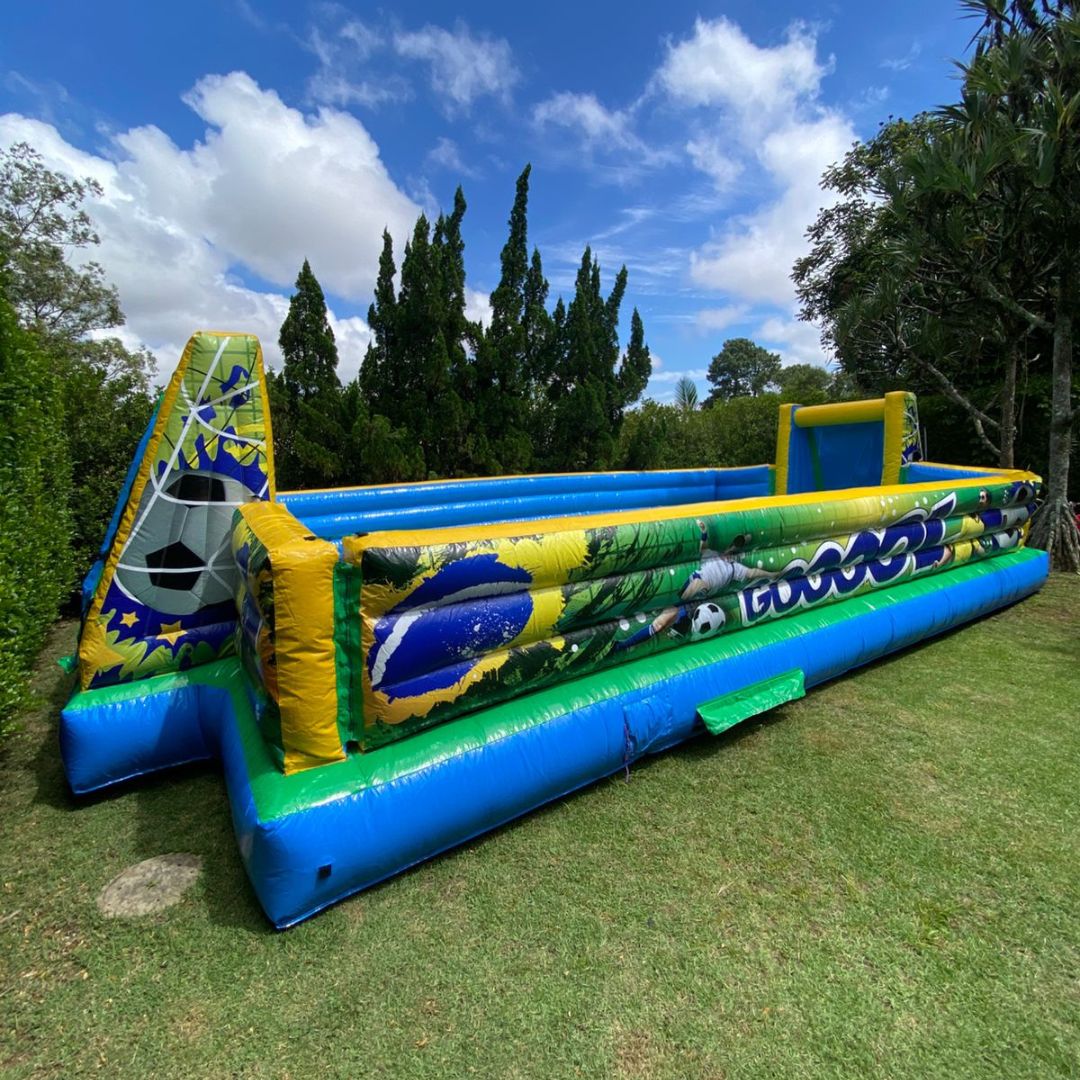 Com uma quadra inflável escorregadia, as crianças (e até os adultos) se divertem tentando jogar futebol em um campo cheio de espuma e emoção!